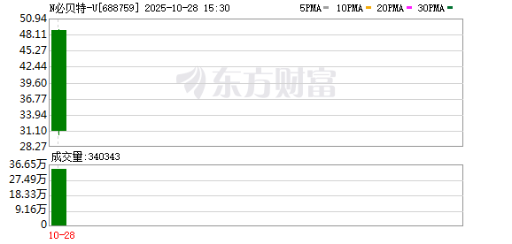 N必贝特-U(688759)今日上市,开盘上涨175.03%,截至收盘涨幅回落至74.41%,全天成交量3403.43万股,成交额11.07亿元,换手率73.25%。