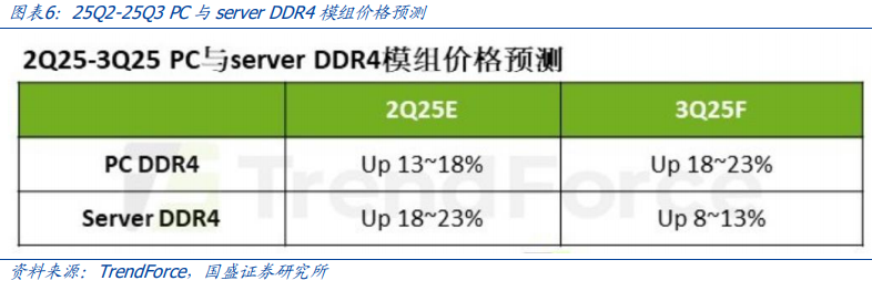 在DRAM主要供应商将逐渐收敛Server和PCDDR4产出、下游积极提前备货等因素影响下,预计Server与PCDDR4模组价格在25Q2将分别环比增长18-23%和13-18%,在25Q3将分别环比增长8%-13%和18%-23%。